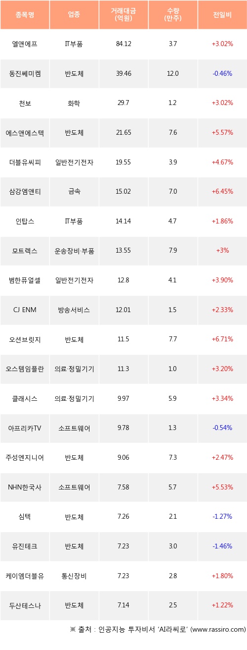 기관 투자자의 순매수 상위 20개 종목은 엘앤에프, 동진쎄미켐, 천보, 에스앤에스텍, 더블유씨피, 삼강엠앤티, 인탑스, 모트렉스, 범한퓨얼셀, CJ ENM등이다.