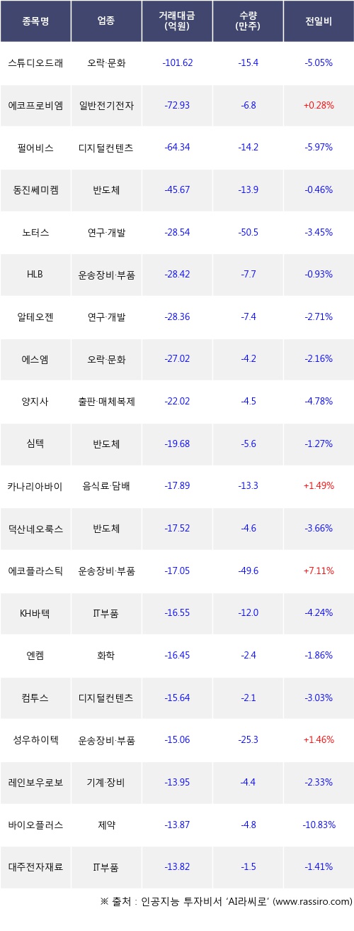 외국인 투자자의 순매도 상위 20개 종목은 스튜디오드래곤, 에코프로비엠, 펄어비스, 동진쎄미켐, 노터스, HLB, 알테오젠, 에스엠, 양지사, 심텍등이다.