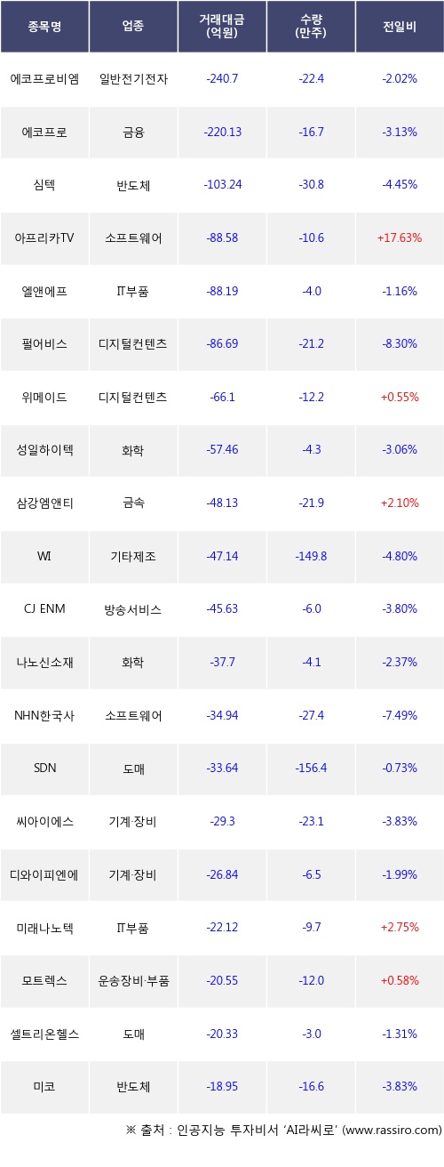 외국인 투자자의 순매도 상위 20개 종목은 에코프로비엠, 에코프로, 심텍, 아프리카TV, 엘앤에프, 펄어비스, 위메이드, 성일하이텍, 삼강엠앤티, WI등이다.