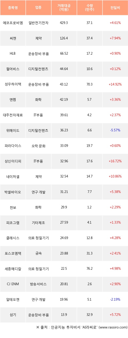 외국인 투자자의 순매수 상위 20개 종목은 에코프로비엠, 씨젠, HLB, 펄어비스, 성우하이텍, 엔켐, 대주전자재료, 위메이드, 파라다이스, 상신이디피등이다.