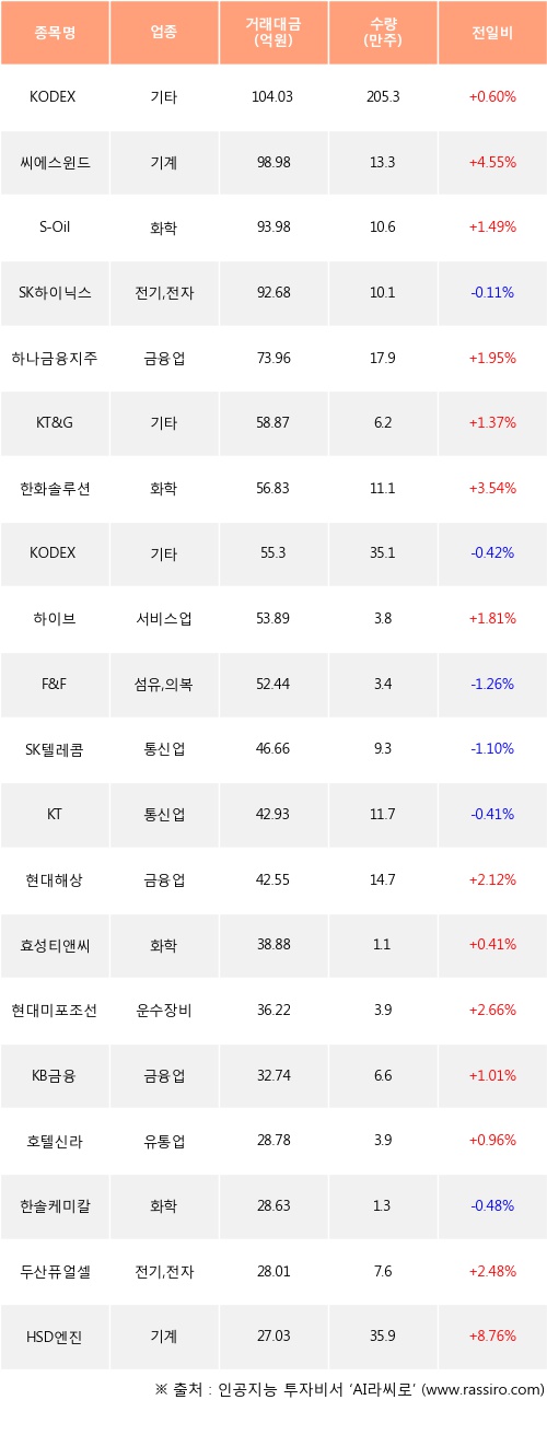 KODEX 코스닥150선물인버스, 씨에스윈드, S-Oil 등은 전일 대비 주가가 상승했고, SK하이닉스, KODEX 레버리지, F&F 등은 주가가 하락했다.