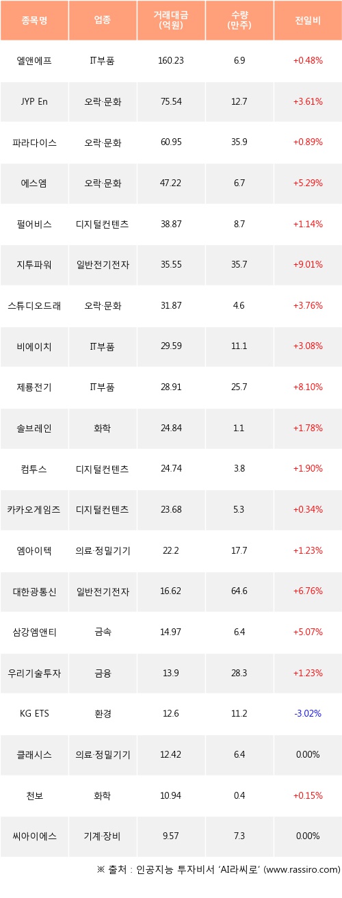 외국인 투자자의 순매수 상위 20개 종목은 엘앤에프, JYP Ent., 파라다이스, 에스엠, 펄어비스, 지투파워, 스튜디오드래곤, 비에이치, 제룡전기, 솔브레인등이다.