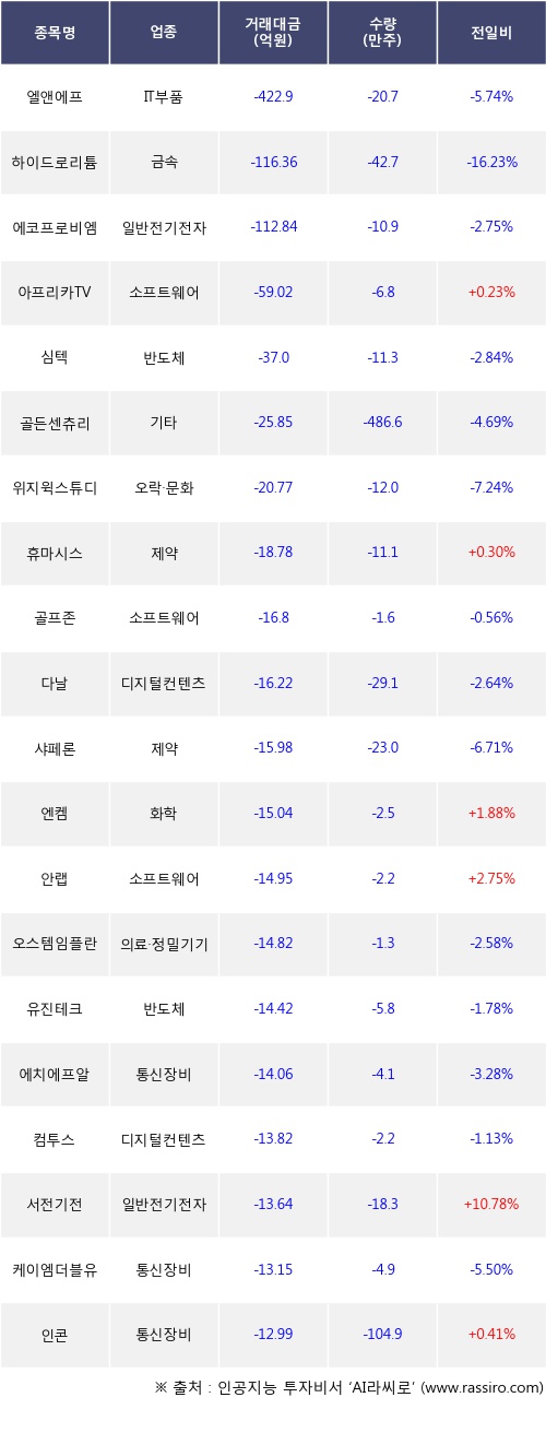 외국인 투자자의 순매도 상위 20개 종목은 엘앤에프, 하이드로리튬, 에코프로비엠, 아프리카TV, 심텍, 골든센츄리, 위지윅스튜디오, 휴마시스, 골프존, 다날등이다.