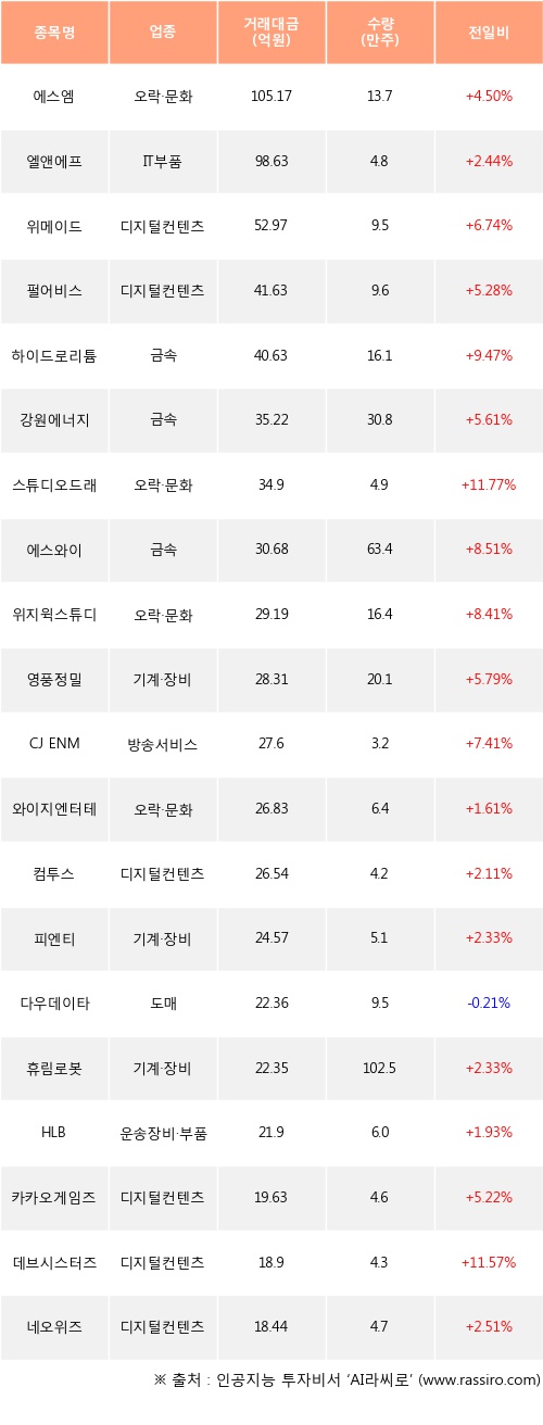 외국인 투자자의 순매수 상위 20개 종목은 에스엠, 엘앤에프, 위메이드, 펄어비스, 하이드로리튬, 강원에너지, 스튜디오드래곤, 에스와이, 위지윅스튜디오, 영풍정밀등이다.