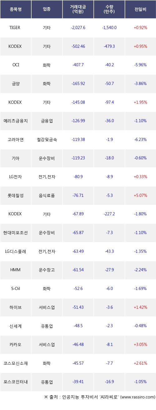 외국인 투자자의 순매도 상위 20개 종목은 TIGER MSCI Korea TR, KODEX 200TR, OCI, 금양, KODEX 레버리지, 메리츠금융지주, 고려아연, 기아, LG전자, 롯데칠성등이다.