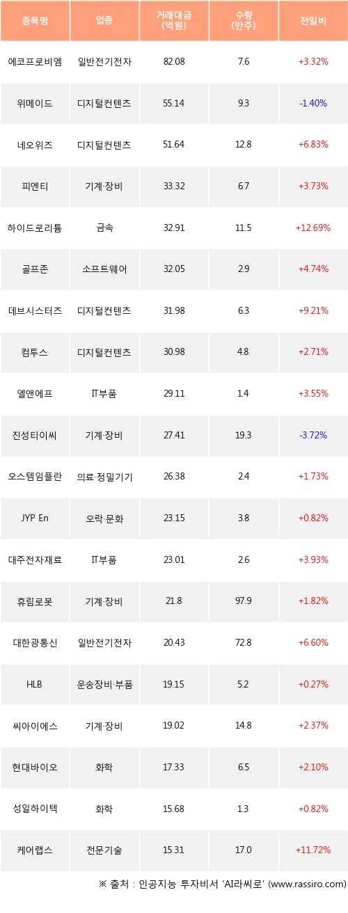 에코프로비엠, 네오위즈, 피엔티 등은 전일 대비 주가가 상승했고, 위메이드, 진성티이씨 등은 주가가 하락했다.