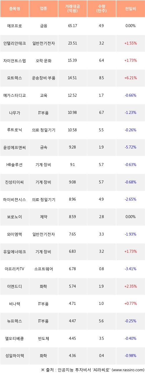기관 투자자의 순매수 상위 20개 종목은 에코프로, 인텔리안테크, 자이언트스텝, 모트렉스, 메가스터디교육, 나무가, 루트로닉, 윤성에프앤씨, HB솔루션, 진성티이씨등이다.