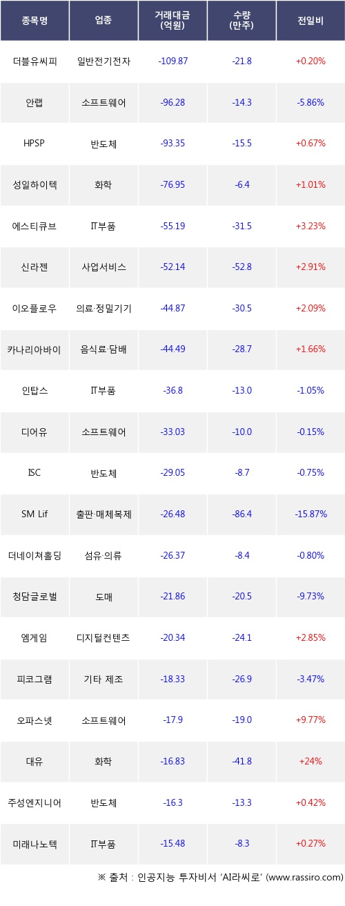 외국인 투자자의 순매도 상위 20개 종목은 더블유씨피, 안랩, HPSP, 성일하이텍, 에스티큐브, 신라젠, 이오플로우, 카나리아바이오, 인탑스, 디어유등이다.