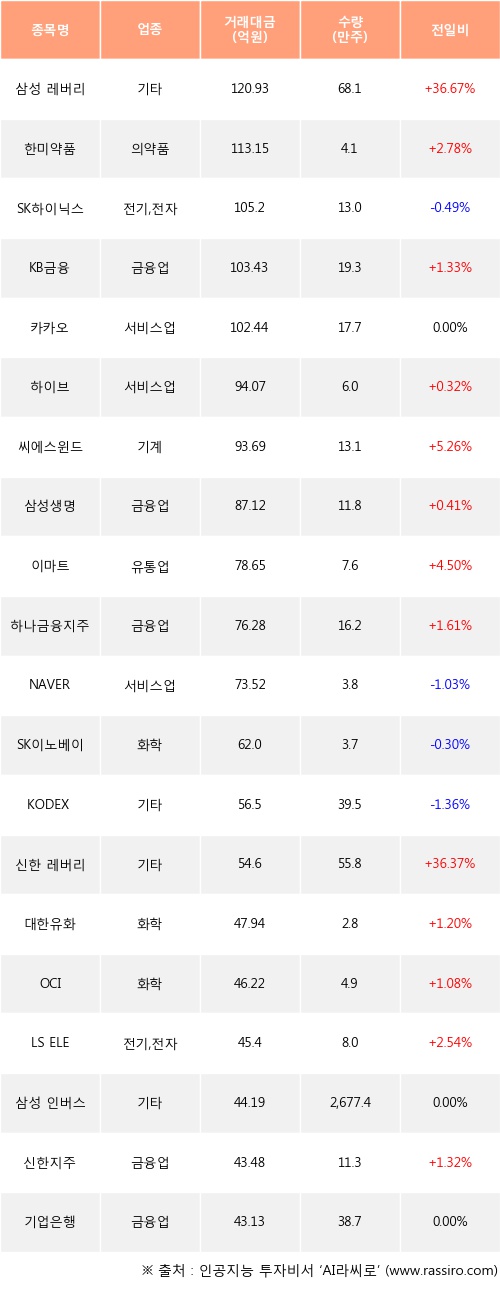 기관 투자자의 순매수 상위 20개 종목은 삼성 레버리지 천연가스 선물 ETN B, 한미약품, SK하이닉스, KB금융, 카카오, 하이브, 씨에스윈드, 삼성생명, 이마트, 하나금융지주등이다.