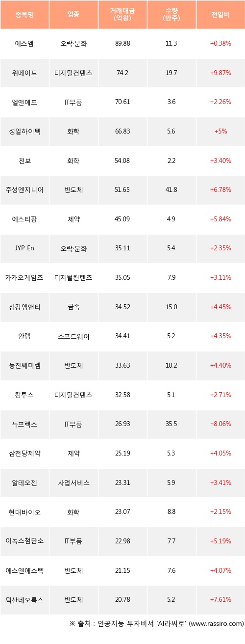 외국인 투자자의 순매수 상위 20개 종목은 에스엠, 위메이드, 엘앤에프, 성일하이텍, 천보, 주성엔지니어링, 에스티팜, JYP Ent., 카카오게임즈, 삼강엠앤티등이다.