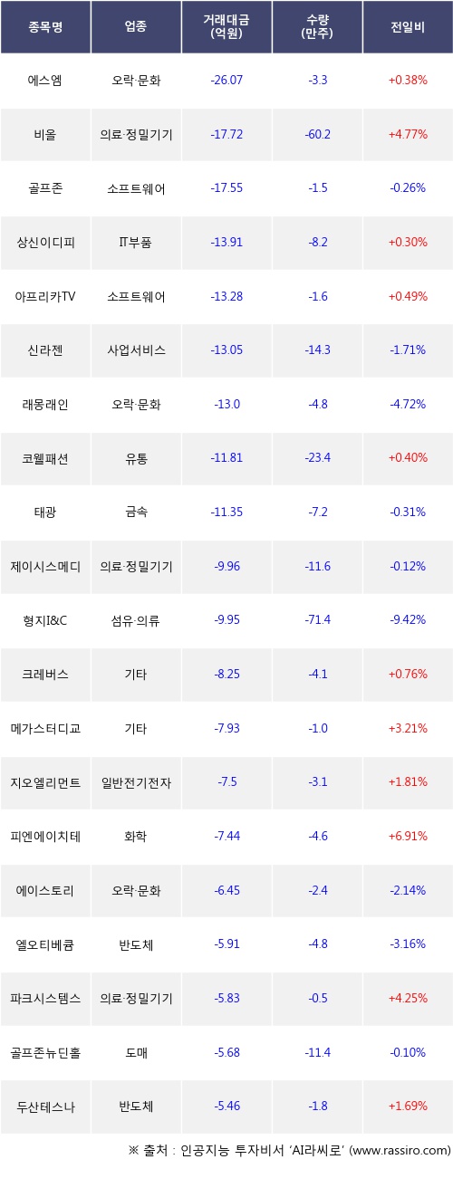 기관 투자자의 순매도 상위 20개 종목은 에스엠, 비올, 골프존, 상신이디피, 아프리카TV, 신라젠, 래몽래인, 코웰패션, 태광, 제이시스메디칼등이다.