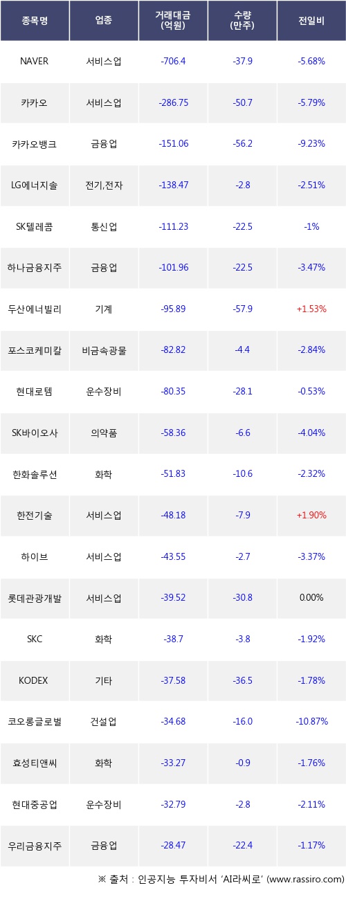 외국인 투자자의 순매도 상위 20개 종목은 NAVER, 카카오, 카카오뱅크, LG에너지솔루션, SK텔레콤, 하나금융지주, 두산에너빌리티, 포스코케미칼, 현대로템, SK바이오사이언스등이다.