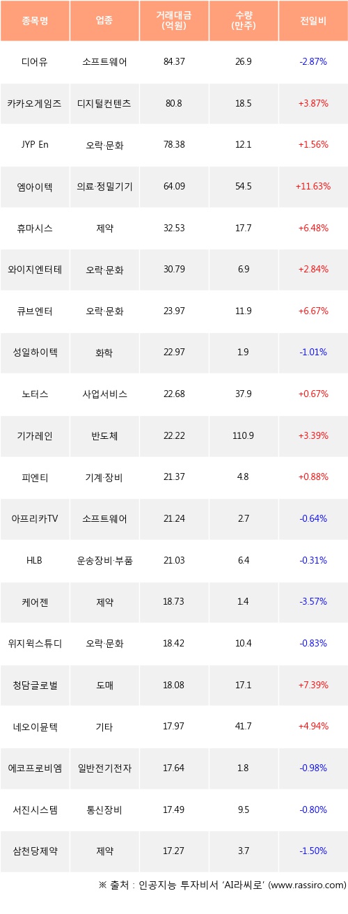 외국인 투자자의 순매수 상위 20개 종목은 디어유, 카카오게임즈, JYP Ent., 엠아이텍, 휴마시스, 와이지엔터테인먼트, 큐브엔터, 성일하이텍, 노터스, 기가레인등이다.