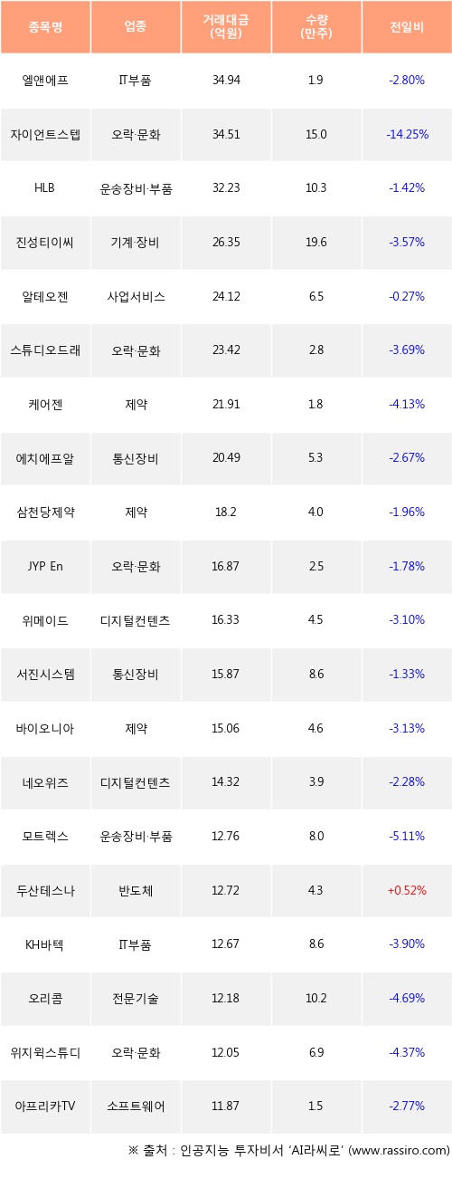 외국인 투자자의 순매수 상위 20개 종목은 엘앤에프, 자이언트스텝, HLB, 진성티이씨, 알테오젠, 스튜디오드래곤, 케어젠, 에치에프알, 삼천당제약, JYP Ent.등이다.