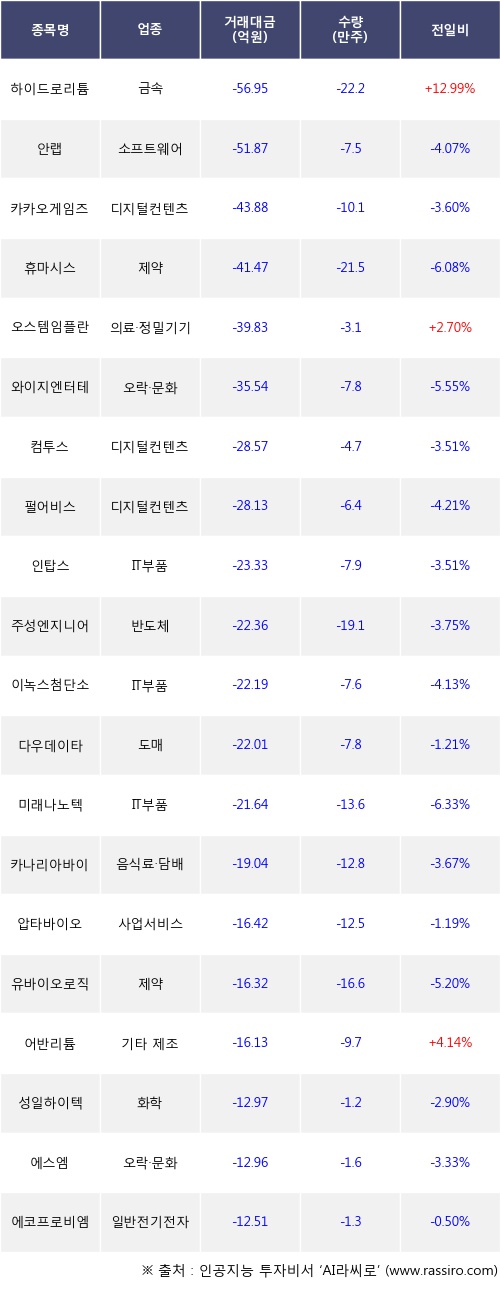 외국인 투자자의 순매도 상위 20개 종목은 하이드로리튬, 안랩, 카카오게임즈, 휴마시스, 오스템임플란트, 와이지엔터테인먼트, 컴투스, 펄어비스, 인탑스, 주성엔지니어링등이다.