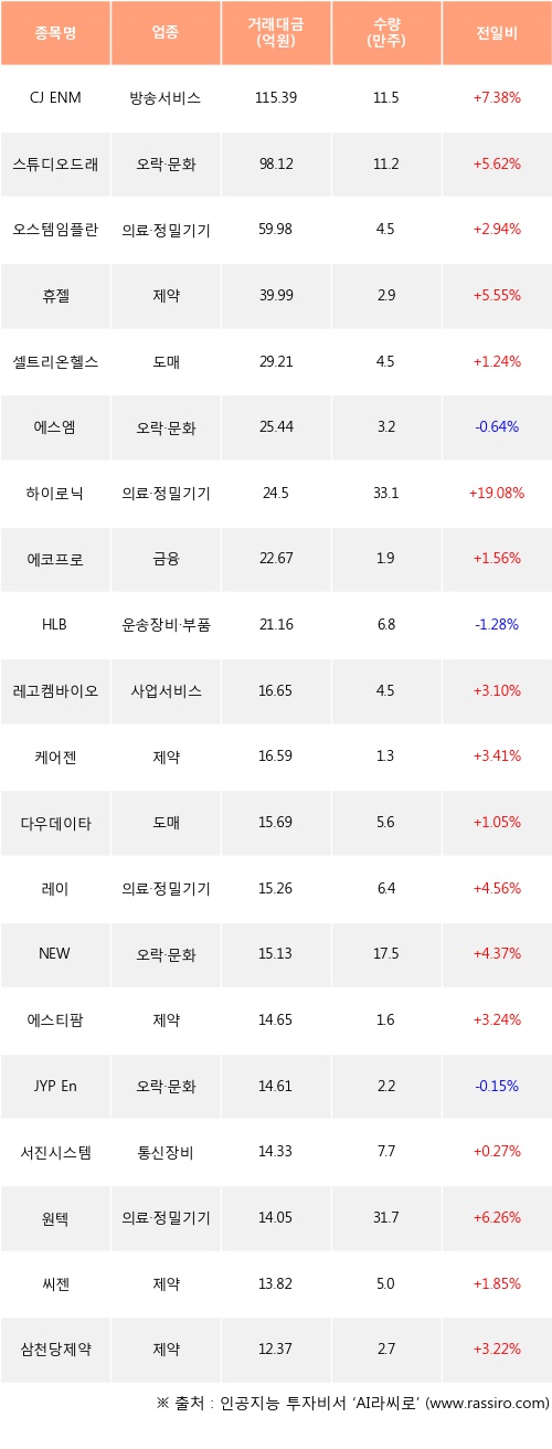 CJ ENM, 스튜디오드래곤, 오스템임플란트 등은 전일 대비 주가가 상승했고, 에스엠, HLB, JYP Ent. 등은 주가가 하락했다.