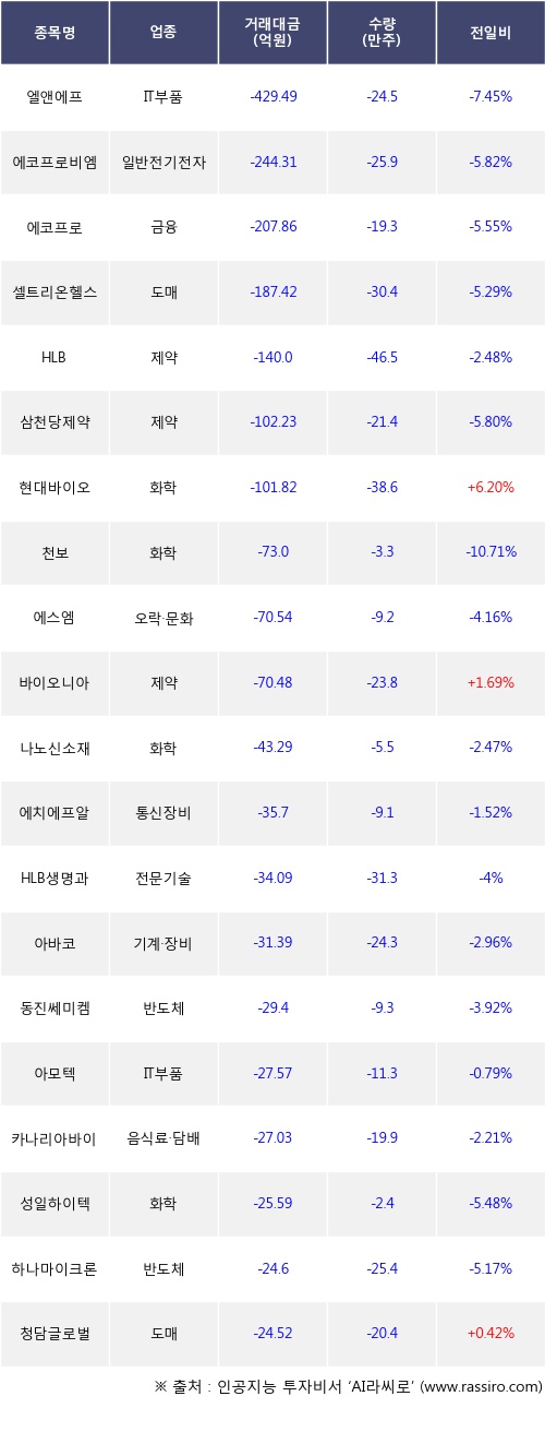 외국인 투자자의 순매도 상위 20개 종목은 엘앤에프, 에코프로비엠, 에코프로, 셀트리온헬스케어, HLB, 삼천당제약, 현대바이오, 천보, 에스엠, 바이오니아등이다.