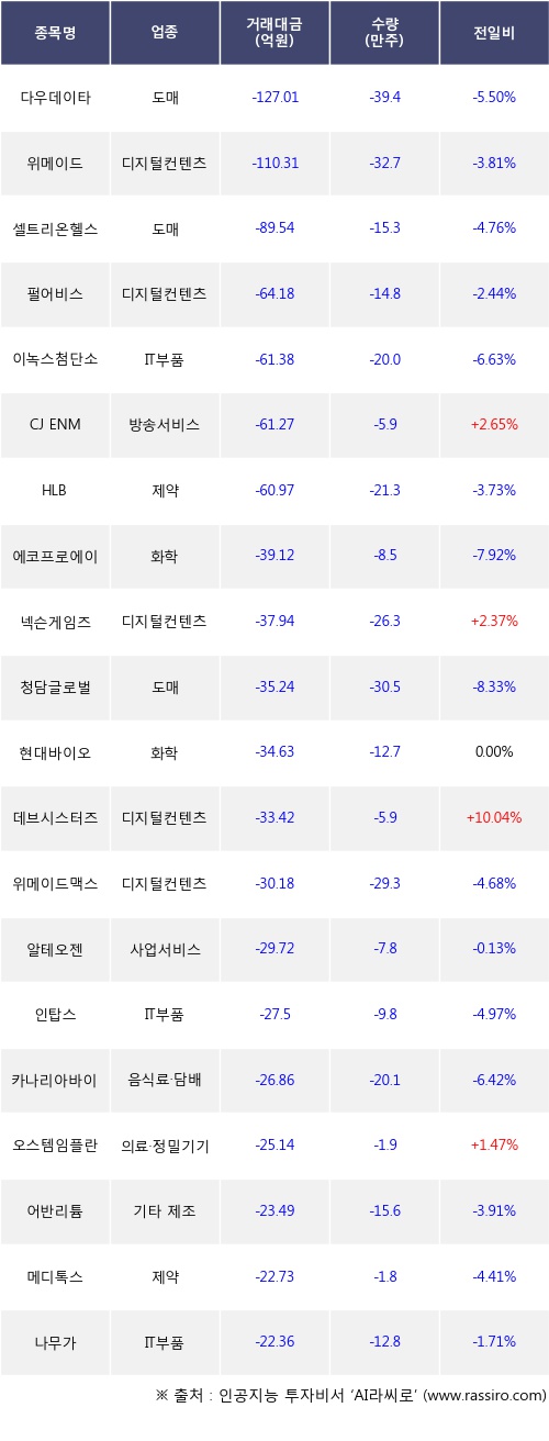 외국인 투자자의 순매도 상위 20개 종목은 다우데이타, 위메이드, 셀트리온헬스케어, 펄어비스, 이녹스첨단소재, CJ ENM, HLB, 에코프로에이치엔, 넥슨게임즈, 청담글로벌등이다.