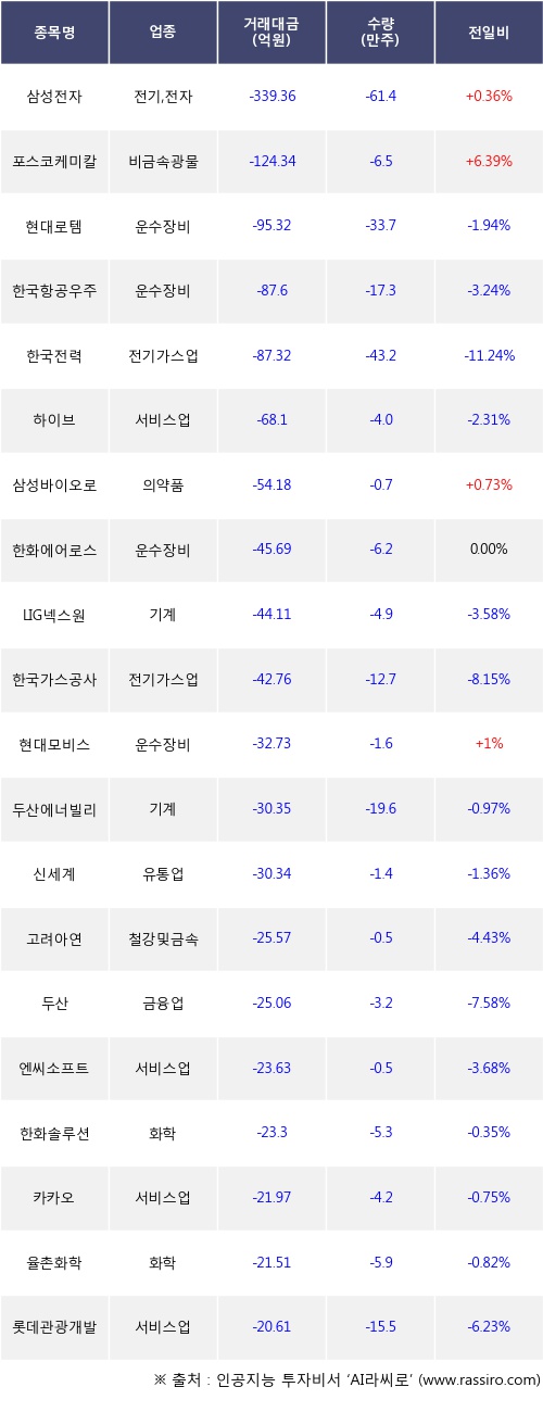 외국인 투자자의 순매도 상위 20개 종목은 삼성전자, 포스코케미칼, 현대로템, 한국항공우주, 한국전력, 하이브, 삼성바이오로직스, 한화에어로스페이스, LIG넥스원, 한국가스공사등이다.