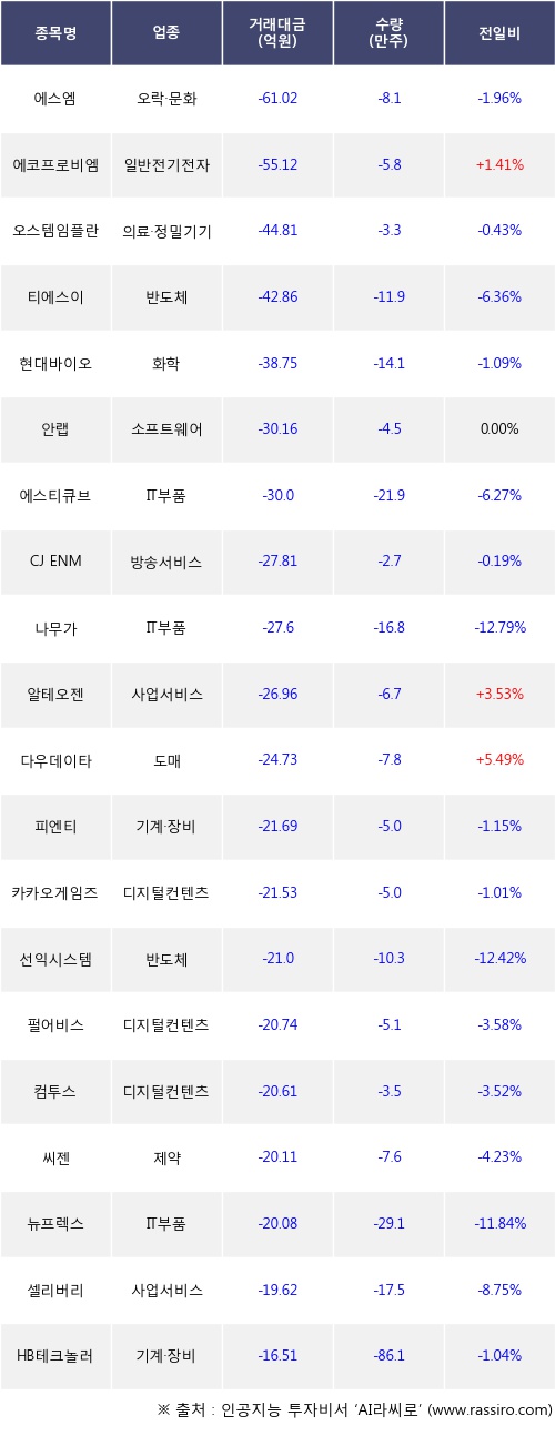 외국인 투자자의 순매도 상위 20개 종목은 에스엠, 에코프로비엠, 오스템임플란트, 티에스이, 현대바이오, 안랩, 에스티큐브, CJ ENM, 나무가, 알테오젠등이다.