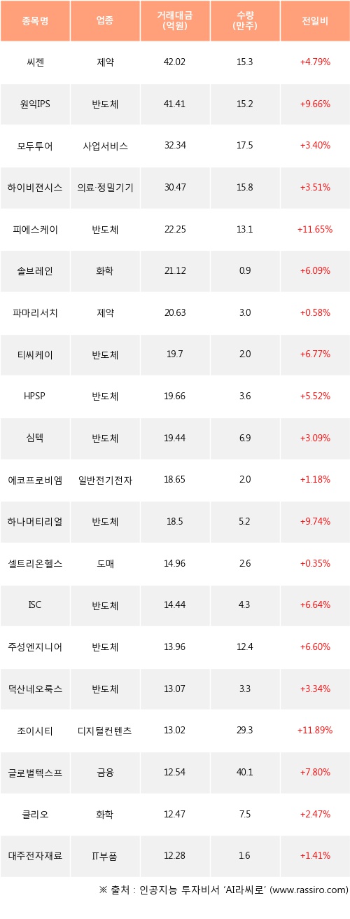 기관 투자자의 순매수 상위 20개 종목은 씨젠, 원익IPS, 모두투어, 하이비젼시스템, 피에스케이, 솔브레인, 파마리서치, 티씨케이, HPSP, 심텍등이다.