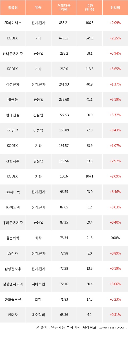 기관 투자자의 순매수 상위 20개 종목은 SK하이닉스, KODEX 레버리지, 하나금융지주, KODEX 코스닥150레버리지, 삼성전자, KB금융, 현대건설, GS건설, KODEX 200, 신한지주등이다.