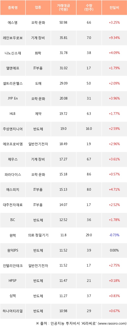 에스엠, 레인보우로보틱스, 나노신소재 등은 전일 대비 주가가 상승했고, 원텍 등은 주가가 하락했다.