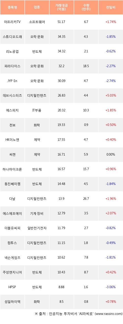 아프리카TV, 데브시스터즈, 에스피지 등은 전일 대비 주가가 상승했고, 스튜디오드래곤, 리노공업, 파라다이스 등은 주가가 하락했다.
