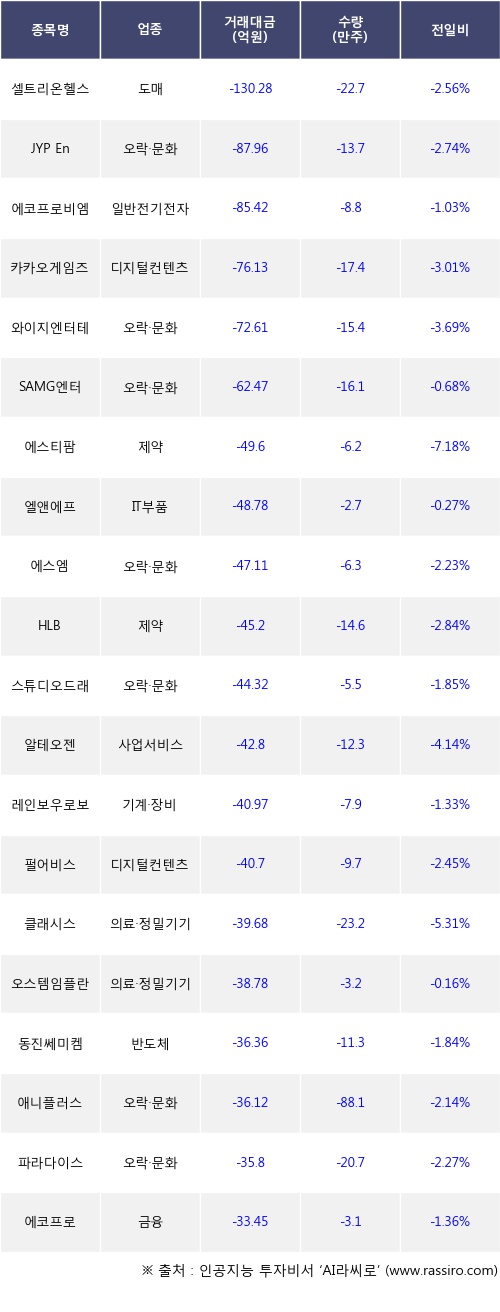 기관 투자자의 순매도 상위 20개 종목은 셀트리온헬스케어, JYP Ent., 에코프로비엠, 카카오게임즈, 와이지엔터테인먼트, SAMG엔터, 에스티팜, 엘앤에프, 에스엠, HLB등이다.