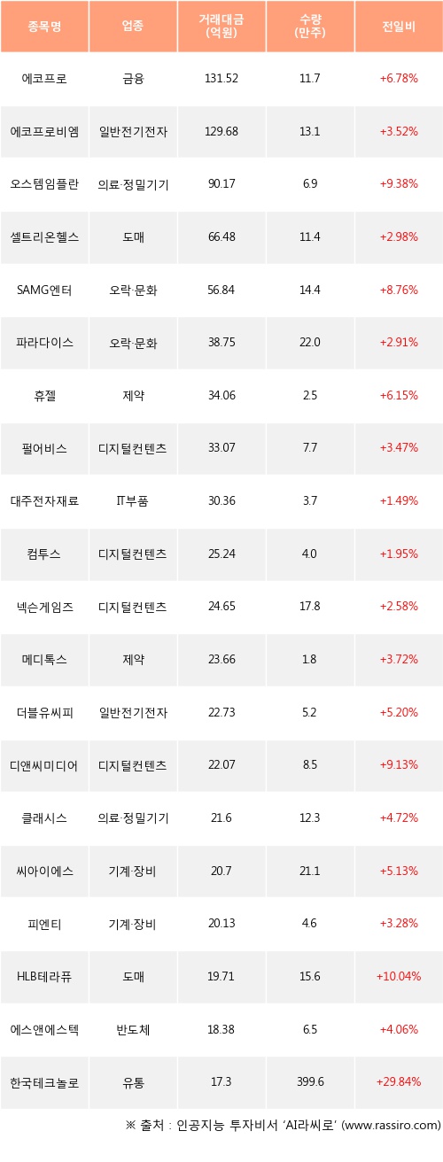 외국인 투자자의 순매수 상위 20개 종목은 에코프로, 에코프로비엠, 오스템임플란트, 셀트리온헬스케어, SAMG엔터, 파라다이스, 휴젤, 펄어비스, 대주전자재료, 컴투스등이다.
