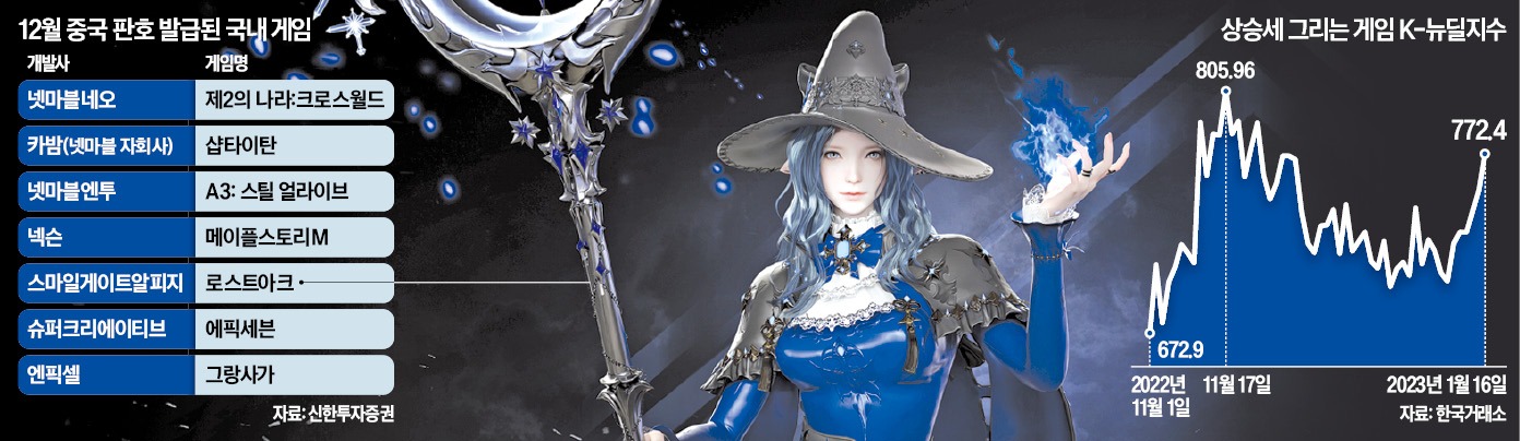 지난달 28일 중국이 넥슨, 넷마블, 스마일게이트 등 한국 기업의 게임 8종에 허가를 내준 것도 주가를 끌어올리고 있다는 평가다. 2017년 본격화한 한한령 이후 5년여 만에 가장 많은 기업이 허가를 받았다. 올해 중국 게임 시장 규모 전망치는 약 45조원으로 글로벌 게임 시장의 22%가량을 차지하고 있다.