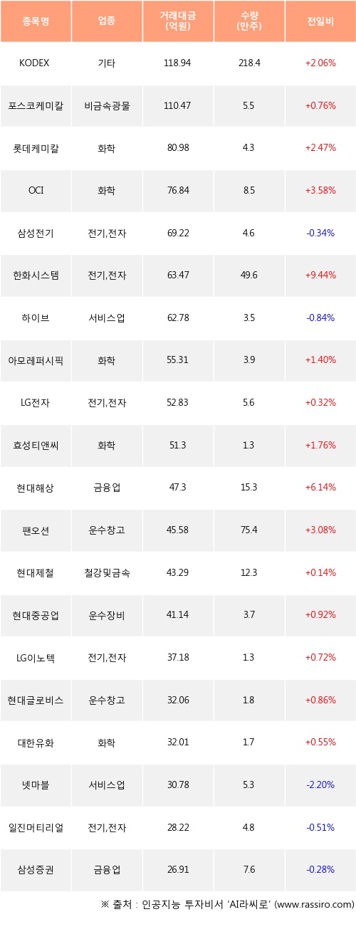 기관 투자자의 순매수 상위 20개 종목은 KODEX 코스닥150선물인버스, 포스코케미칼, 롯데케미칼, OCI, 삼성전기, 한화시스템, 하이브, 아모레퍼시픽, LG전자, 효성티앤씨등이다.