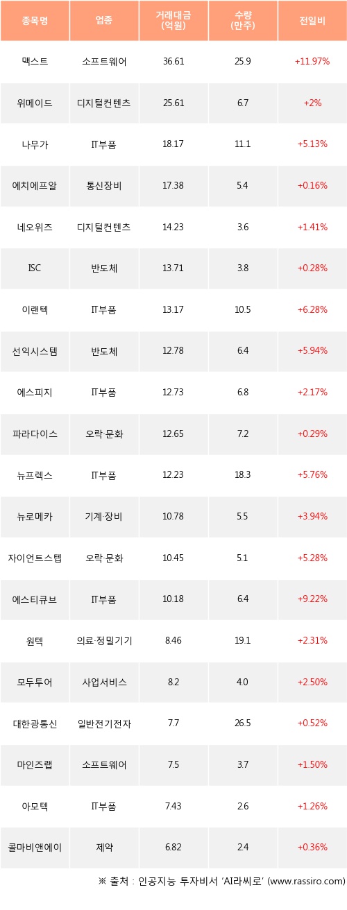 기관 투자자의 순매수 상위 20개 종목은 맥스트, 위메이드, 나무가, 에치에프알, 네오위즈, ISC, 이랜텍, 선익시스템, 에스피지, 파라다이스등이다.