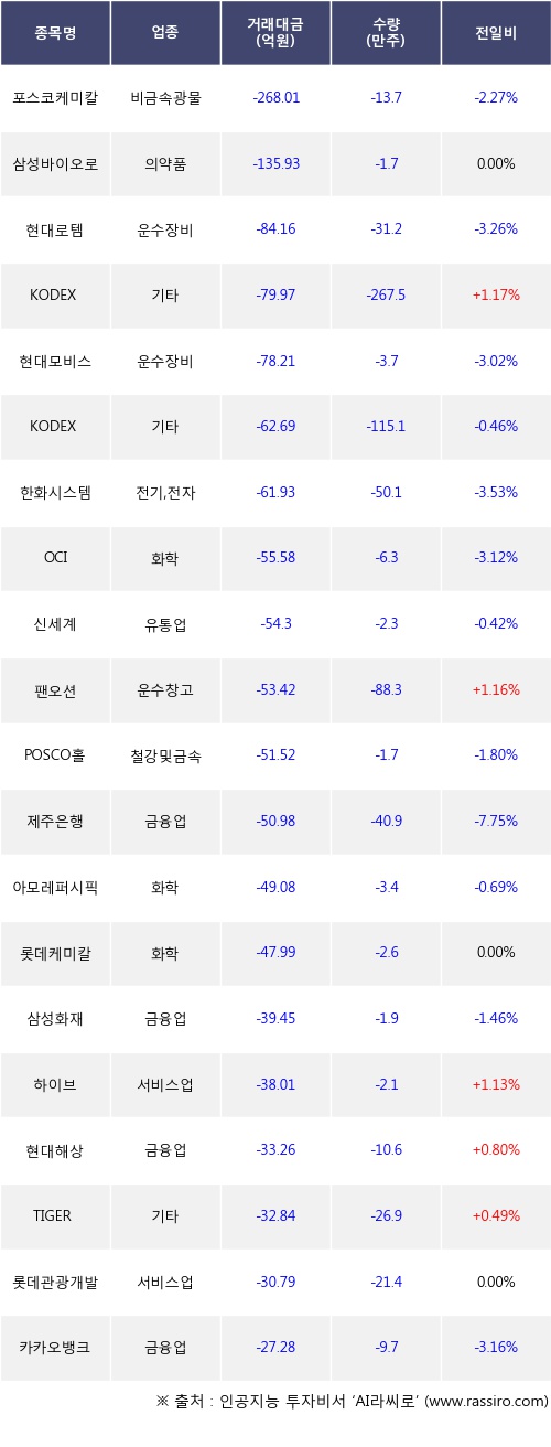 외국인 투자자의 순매도 상위 20개 종목은 포스코케미칼, 삼성바이오로직스, 현대로템, KODEX 200선물인버스2X, 현대모비스, KODEX 코스닥150선물인버스, 한화시스템, OCI, 신세계, 팬오션등이다.