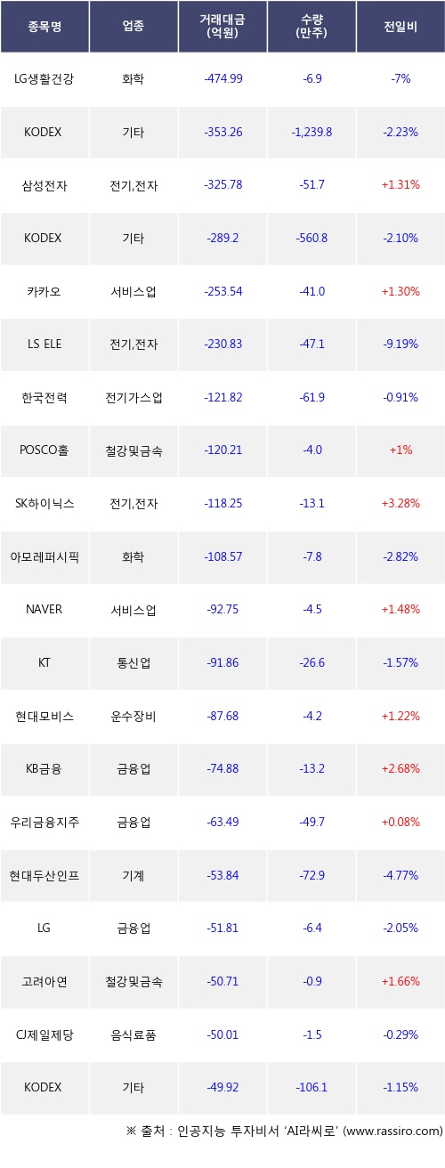기관 투자자의 순매도 상위 20개 종목은 LG생활건강, KODEX 200선물인버스2X, 삼성전자, KODEX 코스닥150선물인버스, 카카오, LS ELECTRIC, 한국전력, POSCO홀딩스, SK하이닉스, 아모레퍼시픽등이다.