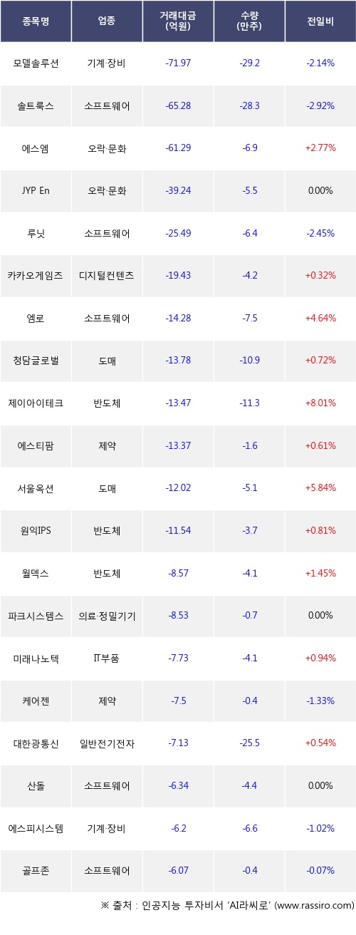 기관 투자자의 순매도 상위 20개 종목은 모델솔루션, 솔트룩스, 에스엠, JYP Ent., 루닛, 카카오게임즈, 엠로, 청담글로벌, 제이아이테크, 에스티팜등이다.