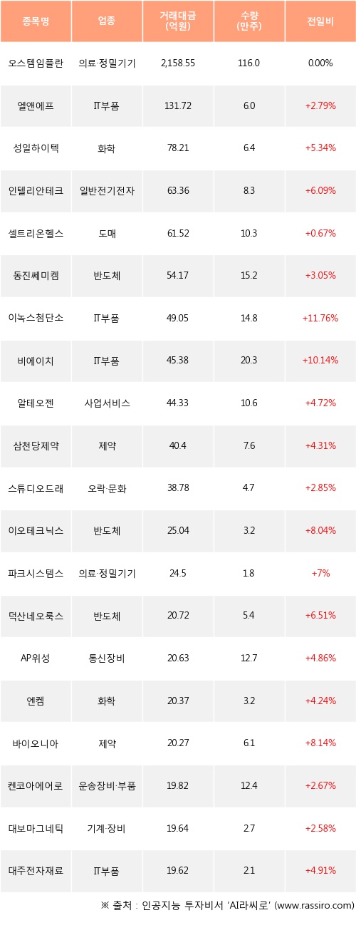 기관 투자자의 순매수 상위 20개 종목은 오스템임플란트, 엘앤에프, 성일하이텍, 인텔리안테크, 셀트리온헬스케어, 동진쎄미켐, 이녹스첨단소재, 비에이치, 알테오젠, 삼천당제약등이다.