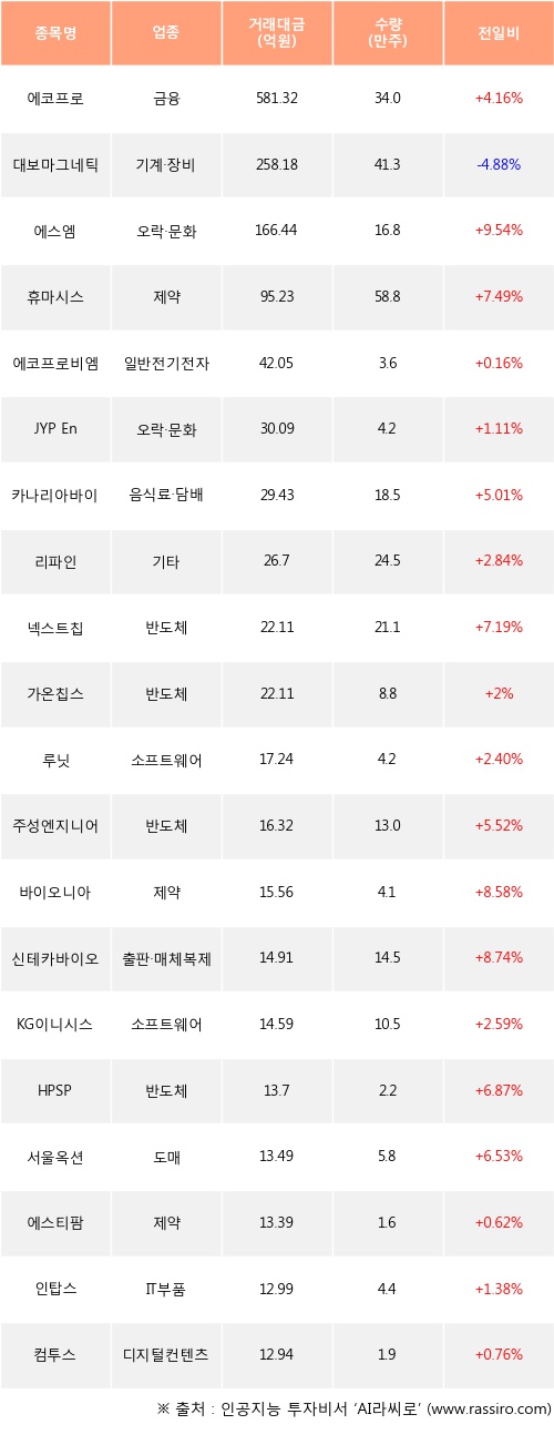 에코프로, 에스엠, 휴마시스 등은 전일 대비 주가가 상승했고, 대보마그네틱 등은 주가가 하락했다.