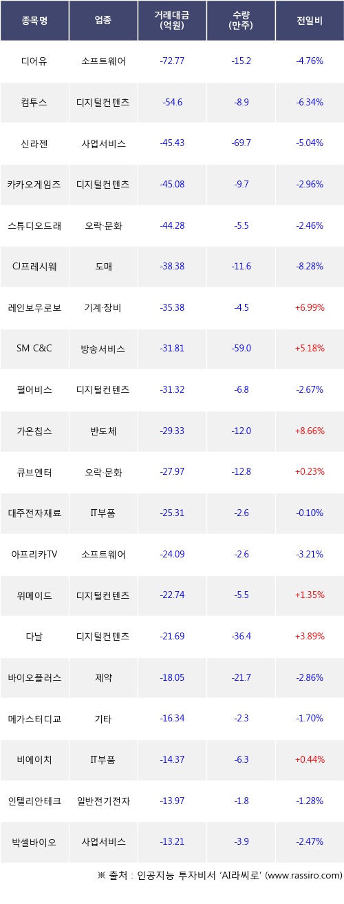 외국인 투자자의 순매도 상위 20개 종목은 디어유, 컴투스, 신라젠, 카카오게임즈, 스튜디오드래곤, CJ프레시웨이, 레인보우로보틱스, SM C&C, 펄어비스, 가온칩스등이다.