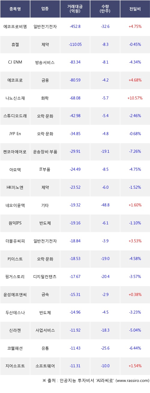 기관 투자자의 순매도 상위 20개 종목은 에코프로비엠, 휴젤, CJ ENM, 에코프로, 나노신소재, 스튜디오드래곤, JYP Ent., 켄코아에어로스페이스, 아모텍, HK이노엔등이다.
