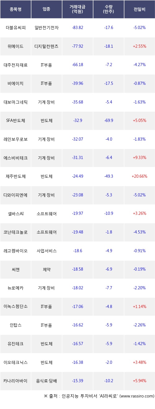 외국인 투자자의 순매도 상위 20개 종목은 더블유씨피, 위메이드, 대주전자재료, 비에이치, 대보마그네틱, SFA반도체, 레인보우로보틱스, 에스비비테크, 제주반도체, 디와이피엔에프등이다.