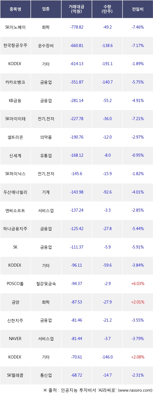 외국인 투자자의 순매도 상위 20개 종목은 SK이노베이션, 한국항공우주, KODEX 200, 카카오뱅크, KB금융, SK아이이테크놀로지, 셀트리온, 신세계, SK하이닉스, 두산에너빌리티등이다.