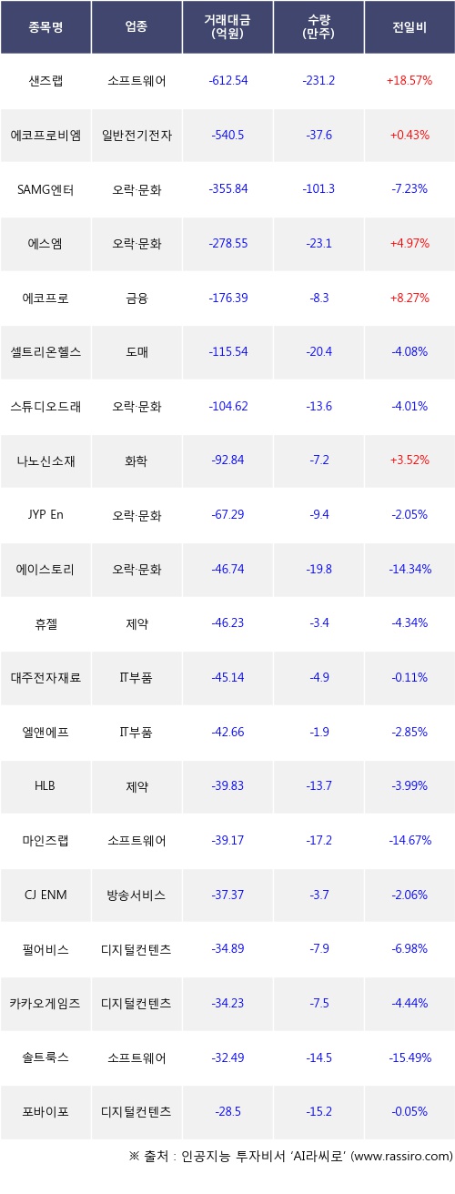 기관 투자자의 순매도 상위 20개 종목은 샌즈랩, 에코프로비엠, SAMG엔터, 에스엠, 에코프로, 셀트리온헬스케어, 스튜디오드래곤, 나노신소재, JYP Ent., 에이스토리등이다.