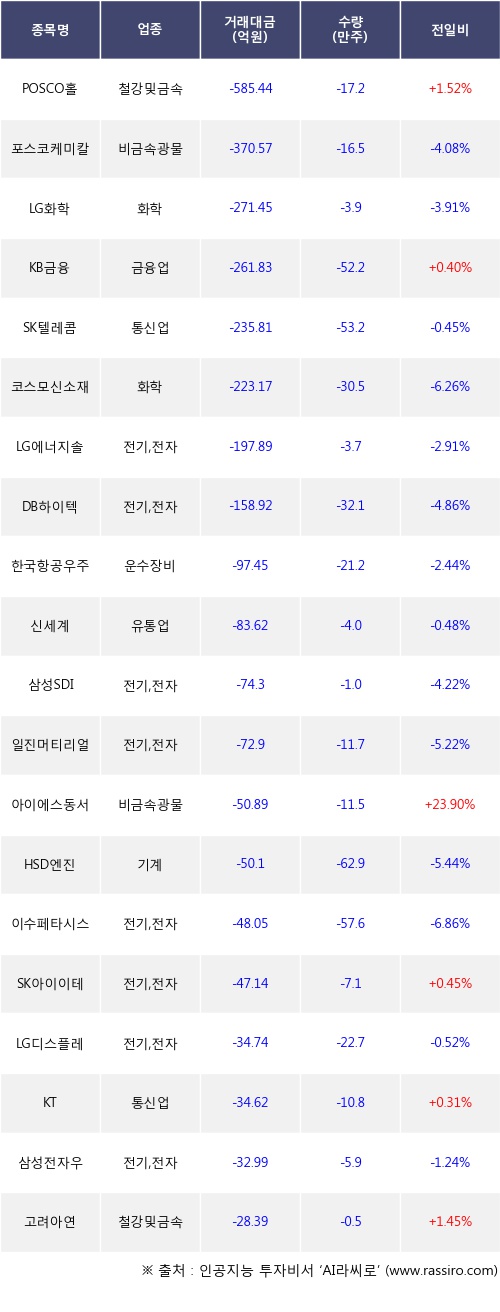 외국인 투자자의 순매도 상위 20개 종목은 POSCO홀딩스, 포스코케미칼, LG화학, KB금융, SK텔레콤, 코스모신소재, LG에너지솔루션, DB하이텍, 한국항공우주, 신세계등이다.