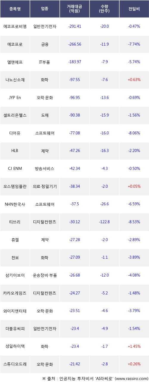 기관 투자자의 순매도 상위 20개 종목은 에코프로비엠, 에코프로, 엘앤에프, 나노신소재, JYP Ent., 셀트리온헬스케어, 디어유, HLB, CJ ENM, 오스템임플란트등이다.