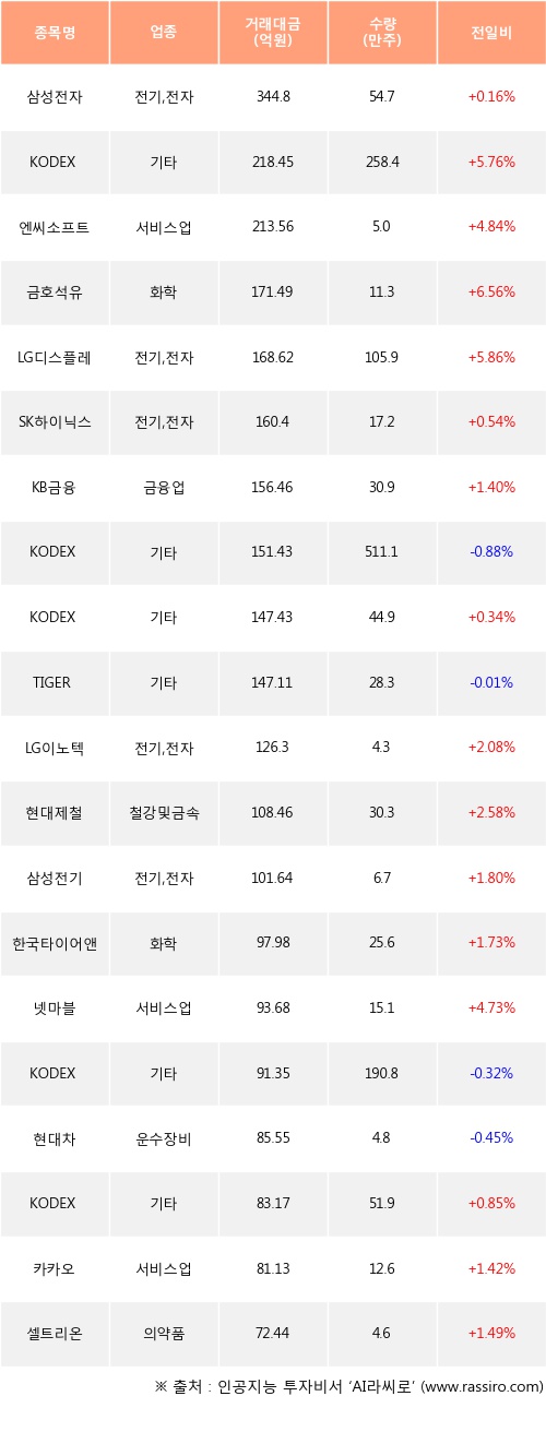 기관 투자자의 순매수 상위 20개 종목은 삼성전자, KODEX 코스닥150레버리지, 엔씨소프트, 금호석유, LG디스플레이, SK하이닉스, KB금융, KODEX 200선물인버스2X, KODEX 200, TIGER CD금리투자KIS(합성)등이다.