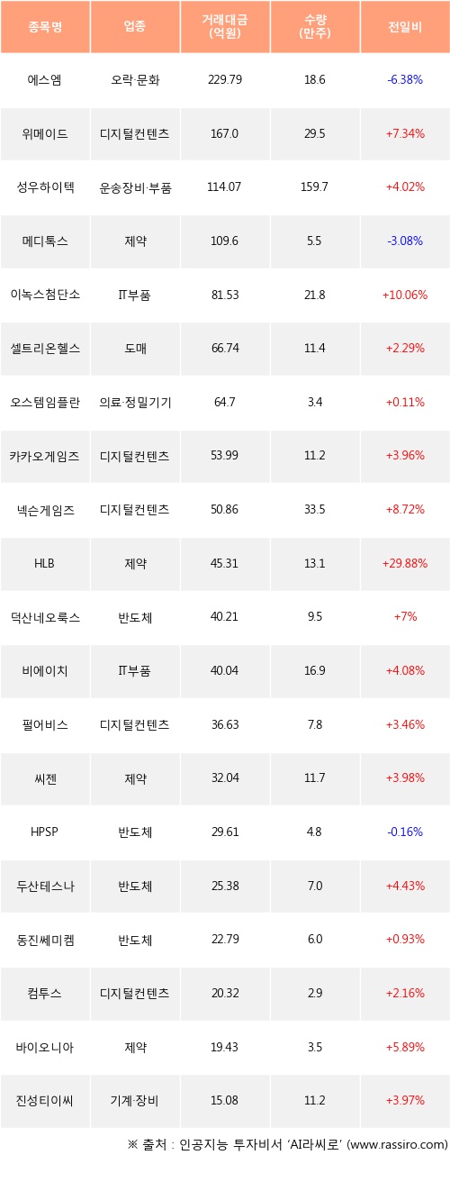 위메이드, 성우하이텍, 이녹스첨단소재 등은 전일 대비 주가가 상승했고, 에스엠, 메디톡스, HPSP 등은 주가가 하락했다.