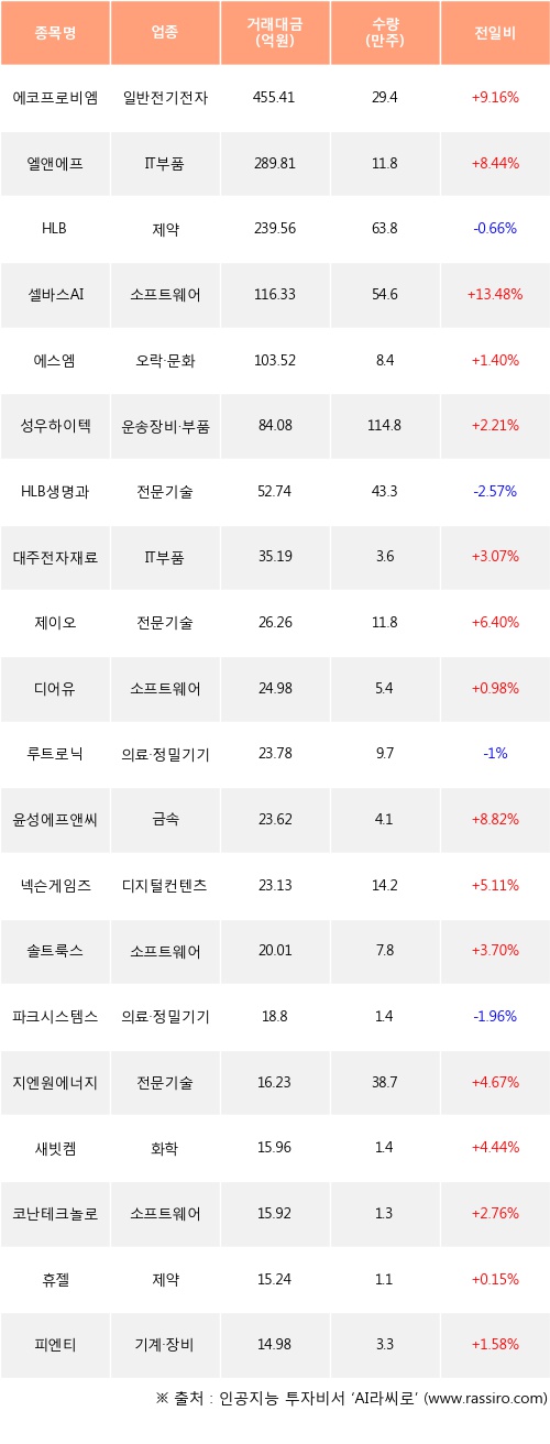 외국인 투자자의 순매수 상위 20개 종목은 에코프로비엠, 엘앤에프, HLB, 셀바스AI, 에스엠, 성우하이텍, HLB생명과학, 대주전자재료, 제이오, 디어유등이다.