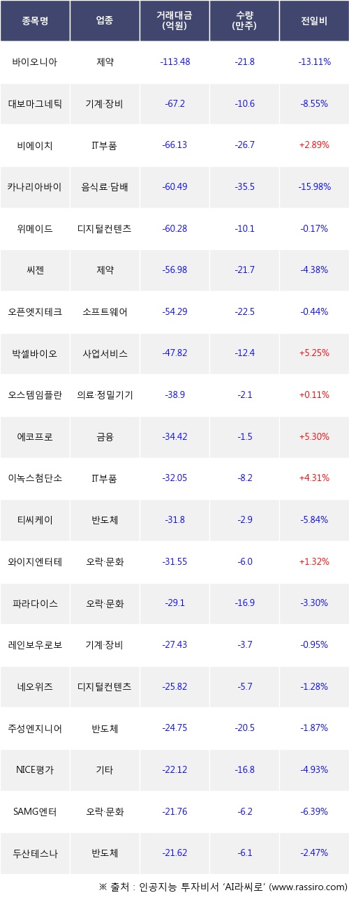 외국인 투자자의 순매도 상위 20개 종목은 바이오니아, 대보마그네틱, 비에이치, 카나리아바이오, 위메이드, 씨젠, 오픈엣지테크놀로지, 박셀바이오, 오스템임플란트, 에코프로등이다.