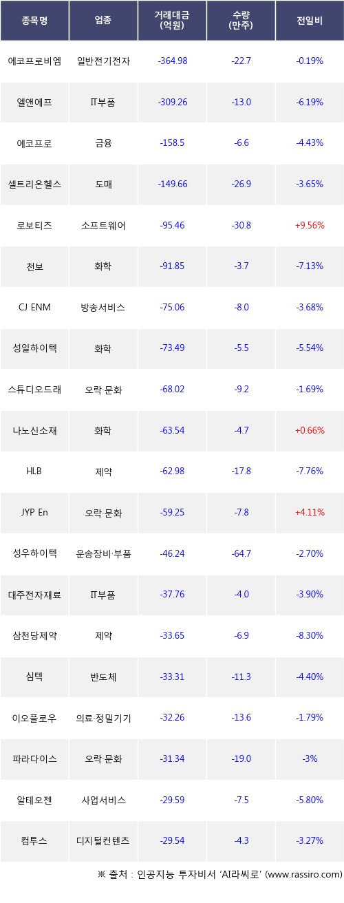 기관 투자자의 순매도 상위 20개 종목은 에코프로비엠, 엘앤에프, 에코프로, 셀트리온헬스케어, 로보티즈, 천보, CJ ENM, 성일하이텍, 스튜디오드래곤, 나노신소재등이다.